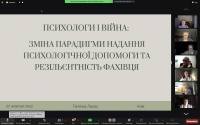 Четвертий вебінар-психологічний практикум відбувся 27 жовтня 2022 р. на платформі Zoom. ТЕМА ВЕБІНАРУ: «ПСИХОЛОГ І ВІЙНА: ЗМІНА ПАРАДИГМИ ПСИХОЛОГІЧНОЇ ДОПОМОГИ ТА РЕЗІЛЬЄНТНІСТЬ»